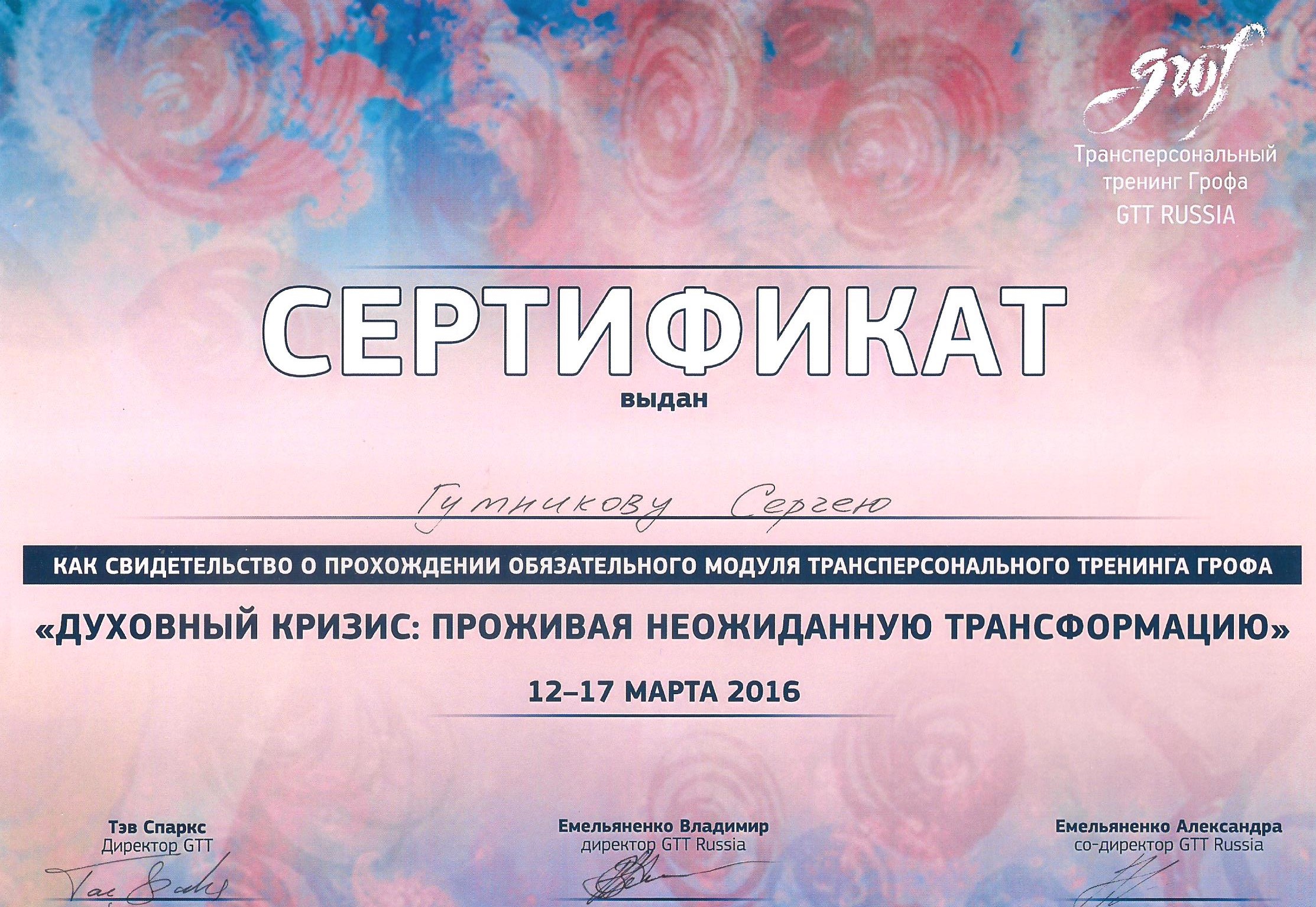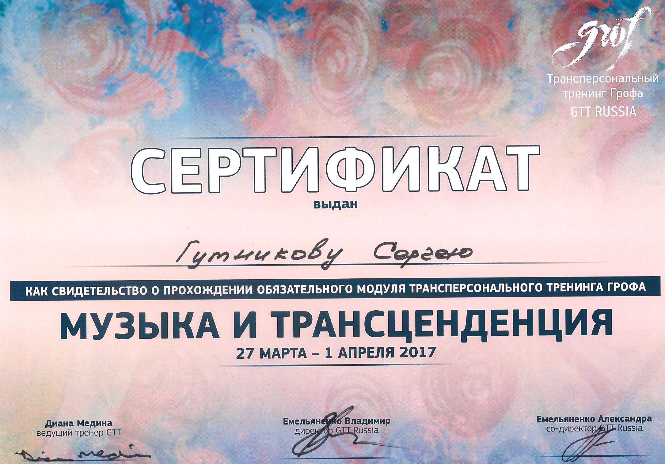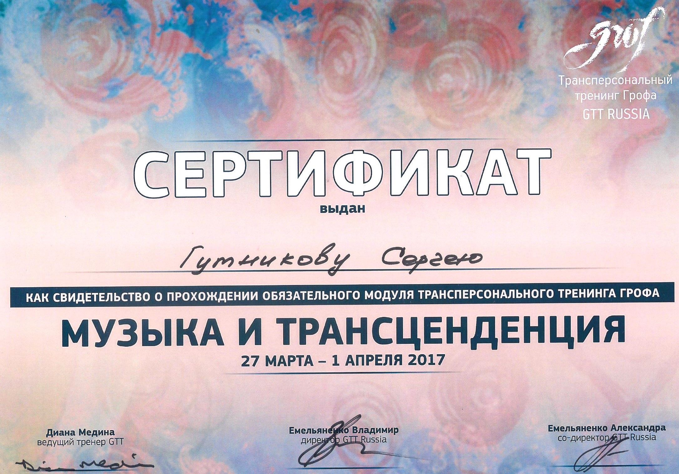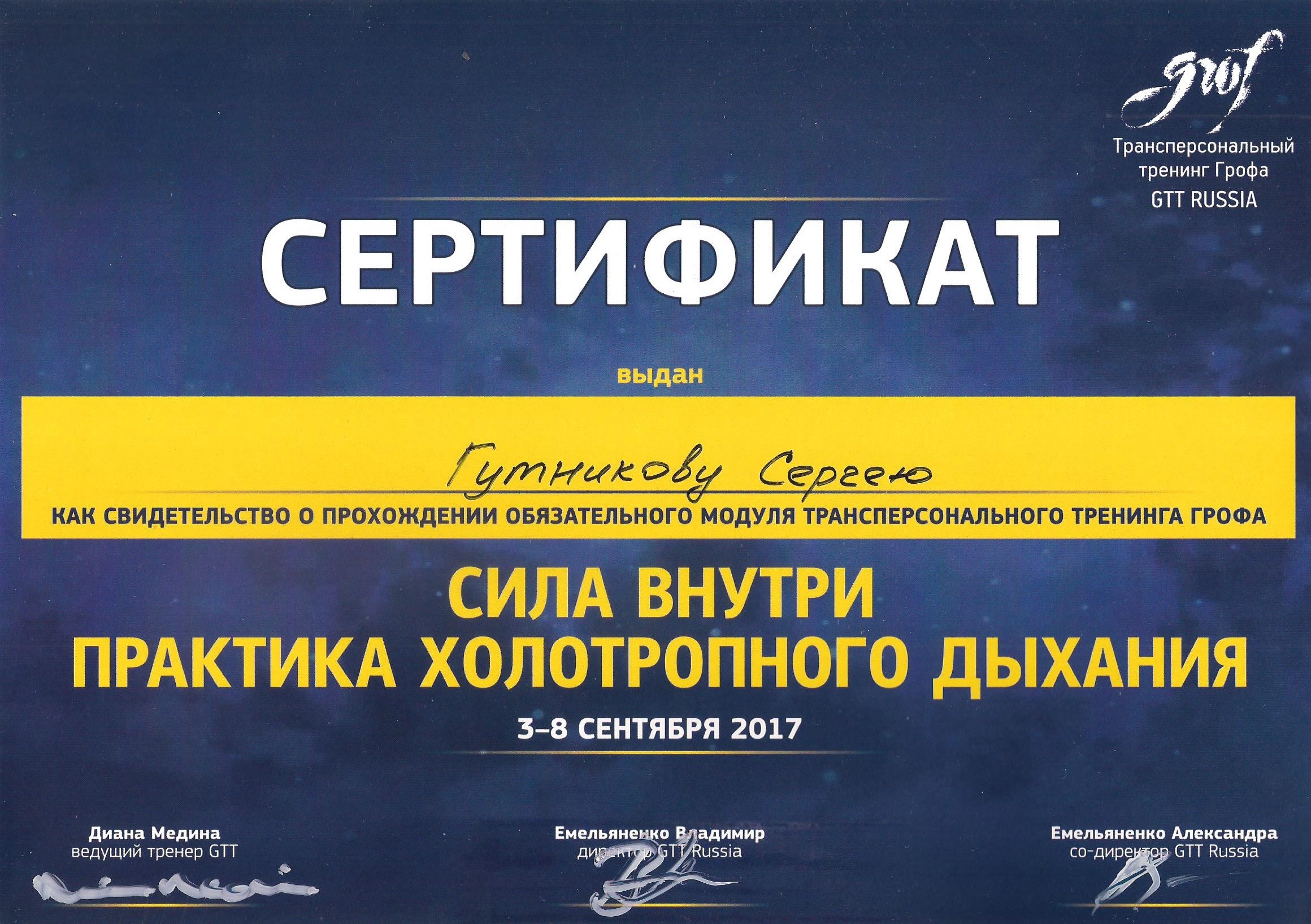 • Участник сертификационной программы по холотропному дыханию (Grof Transpersonal Training)